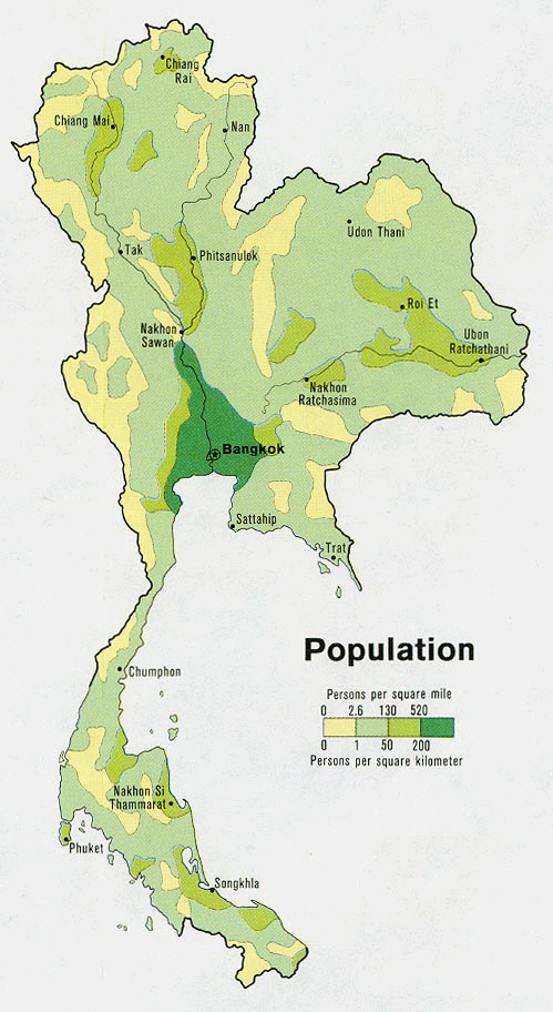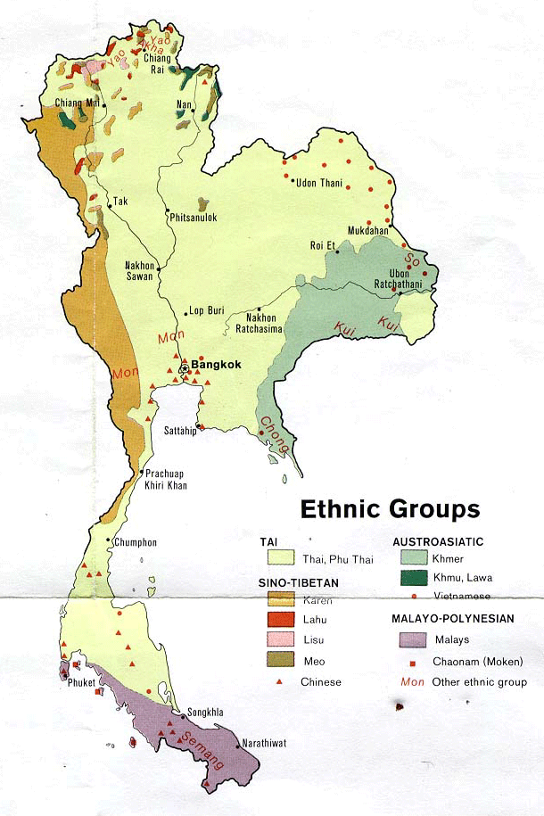 Befolkning: thai, tai yai (shan), lao, kineser, mon, kmer, malajer och bergsfolk (karen, akha, lahu, lisu, yao, hmong) - karta.