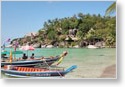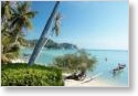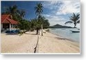 Stranden Hat Sai Ri med hamnen och byn Ban Mae Hat i bakgrunden.