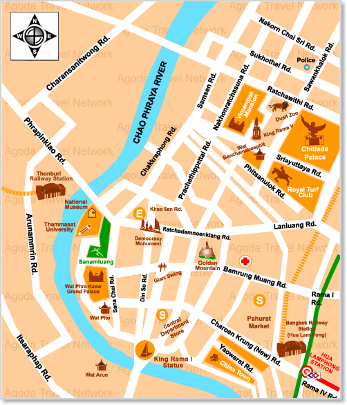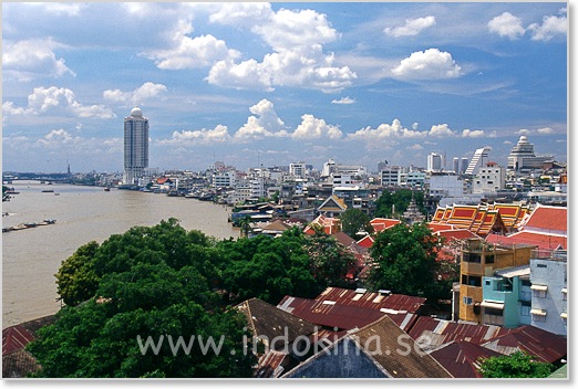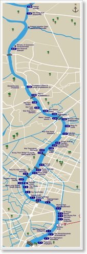 Floden Chao Phraya slingrar sig runt Chinatown och tempelområdet. Se kartor.