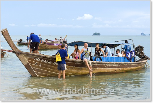 Folk som kommer till Ao Nang efter en dagsutflykt till öarna med long-tail båt.