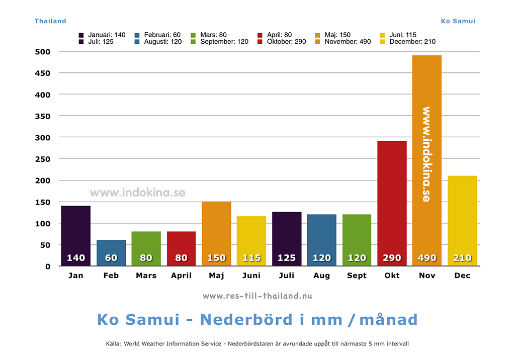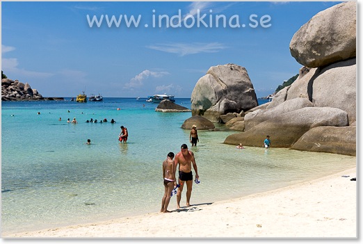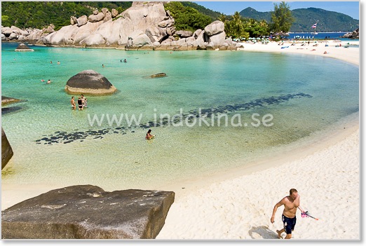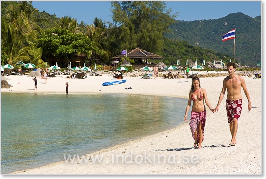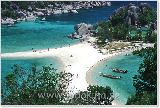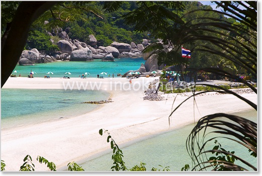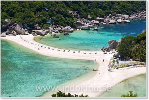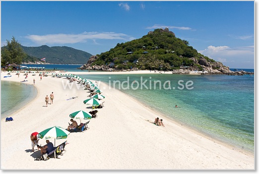 Öarna förenas med två vita sandstränder. Stranden med parasoller försvinner ibland under regnperioden när stora vågor rullar in (se Nederbörd för november Ko Samui).
