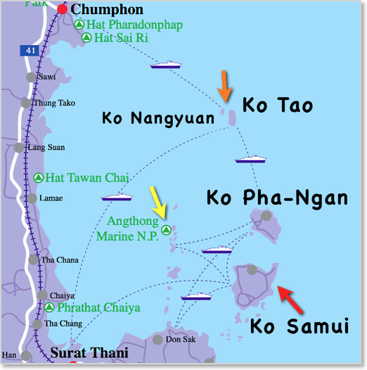 Den lilla ögruppen Ko Nangyuan ligger intill ön Ko Tao - som i sin tur är belägen nordväst om Ko Samui (se karta).