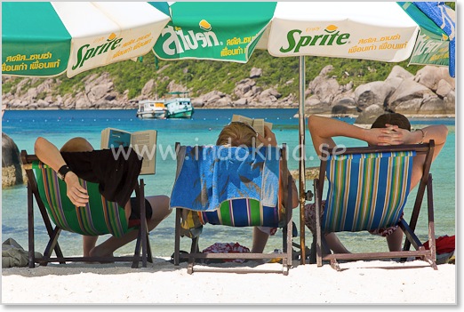 Några turister som tar det lugnt - nästan som i reklamen för spelet Keno. Dykbåtar utanför avspärrningen med bojar. Ko Tao i bakgrunden.