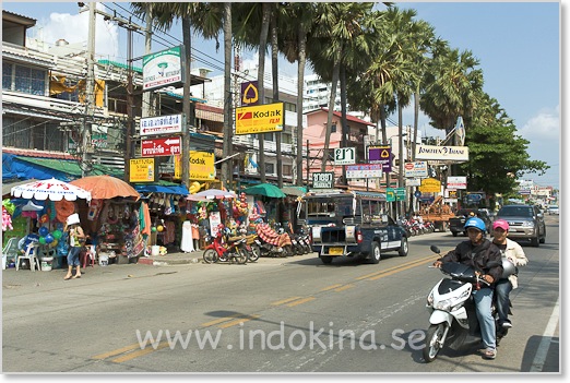Gatan och strandpromenaden i Jomtien. Många bangkokbor och mycket trafik på helgerna.