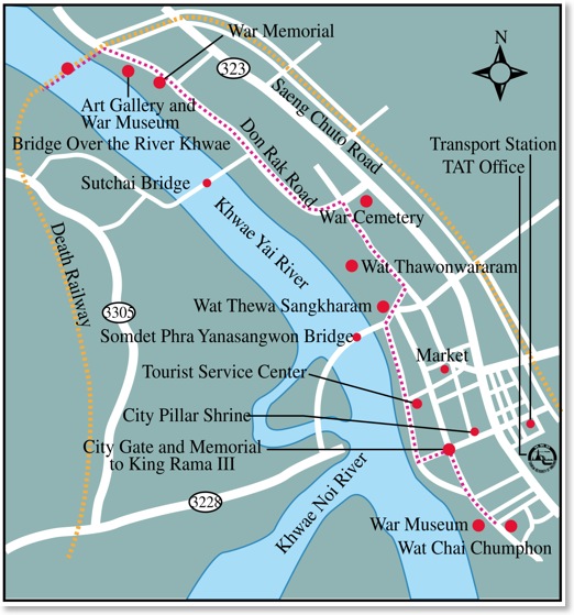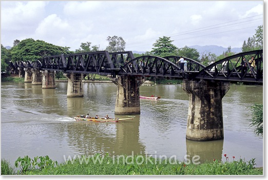 Strax utanför Kanchanaburi finns den berömda bron över floden Kwai. Järnvägen började byggas 1942. Originalbron bombades 1945 under andra världskriget.