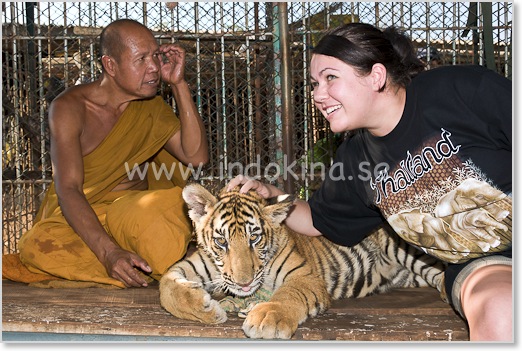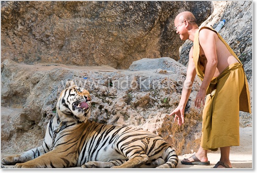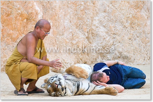 Munken Chan ser ut att prata med tigern . . . Hela området utstrålar lugn och alla viskar.
