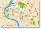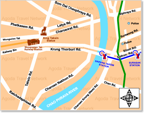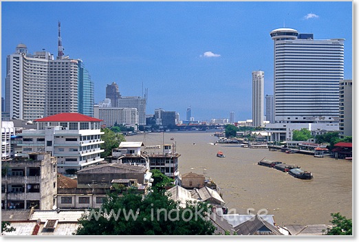 Floden Chao Phraya slingrar sig runt Chinatown och tempelområdet. Se kartor.