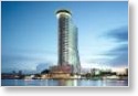 Hilton Millennium med UFO-liknande bar och pool på taket till höger. Saphan Taksin bron i mitten i bakgrunden.