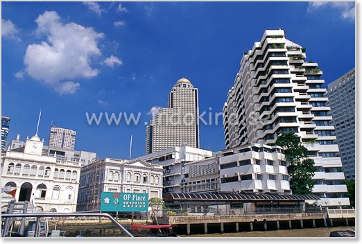 Gamla tullhuset och Shangri-la Hotel. I bakgrunden: Lebua State Tower - The Dome med en utomhusbar på 62:a våningen nedanför guldkupolen.